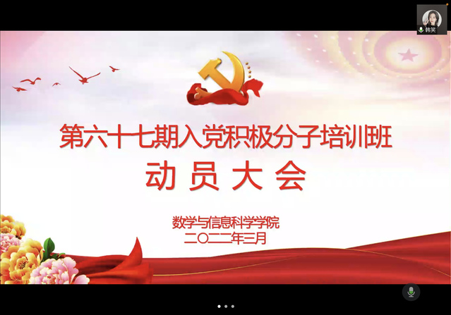 为严格党员发展流程,进一步贯彻落实从严治党的要求,端正入党积极分子的入党动机,提高入党积极分子的党性修养,数学与信息科学学院学生党支部于3月28日晚召开第67期入党积极分子培训班动员大会线上视频会议,会议由支部组织委员周四晴主持,支部书记韩笑、学生支部党员代表以及67期入党积极分子培训班全体学员参加了会议。