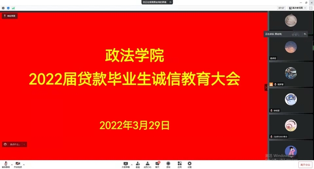 3月29日午,政法学院于线上召开了政法学院2022届贷款毕业生诚信教育大会,学院党委副书记刘放美、毕业班辅导员栗想和2022届国家助学贷款毕业生参加了会议。