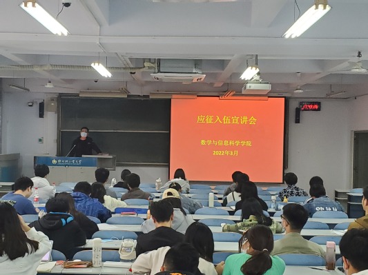 3月29日下午,数学与信息科学学院在教三楼500教室举办2022年大学生征兵入伍宣讲会。学院高度重视国防教育和征兵入伍工作,将征兵入伍宣讲作为学生思想政治教育的重要内容。宣讲会邀请学校武装部黄鹞老师主讲。