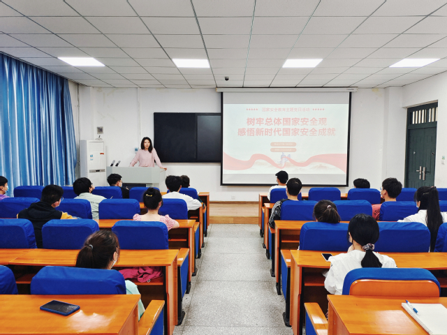 本次活动分为三个环节。在“学讲话”环节,蔡老师领学了《习近平关于防范风险挑战、应对突发事件论述摘编》,集中学习习近平总书记关于国家安全方面的重要讲话,强调同学们在生活和学习中做到居安思危,增强忧患意识、风险意识、责任意识。“讲知识”环节,蔡老师阐述了总体国家安全观的内容,普及了国家安全知识、国家秘密的等级、基本范围与涉密载体的种类,列举了破坏国家安全的行为,提醒同学们注意网络安全与个人生活朋友圈,防止隐私泄露,做到国家安全、人人有责。“谈感悟”环节,同学们在集中观看国家安全教育宣传片后畅所欲言,纷纷表示,维护国家安全是每个组织和公民义不容辞的责任,应从自身做起,在工作、生活中自觉抵制可能会危害到国家安全的潜在因素的侵蚀,切实增强维护国家安全的责任感和使命感。