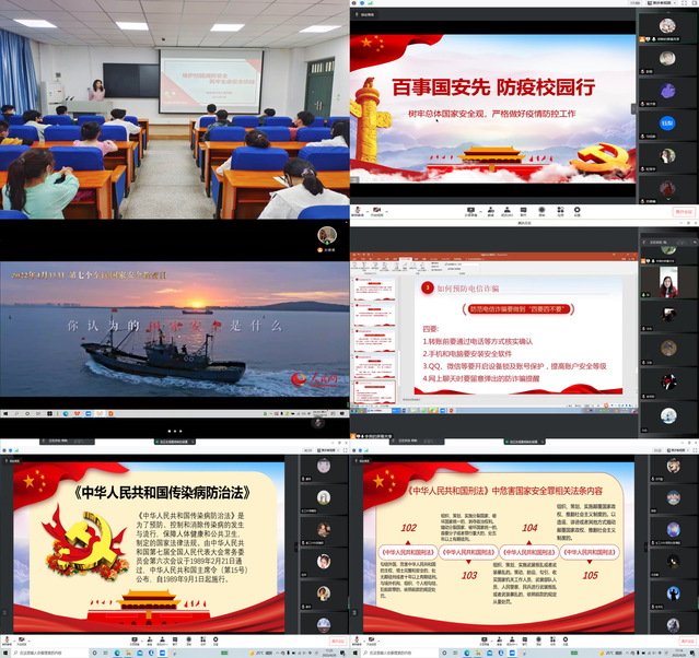 活动中,学院紧扣重要时间节点,结合当前工作实际和青少年法制宣传教育内容,围绕国家安全、消防安全、金融安全、网络安全、疫情防控、突发事件应对等开展专题宣传教育。以班级为单位组织召开“树牢总体国家安全观,青春喜迎党的二十大”主题团日活动,观看各类法治宣传视频及国家安全教育公开课,组织学生进行研讨交流;开展“校园金融教育暨金融安全伴我行”主题金融知识讲座,积极引导青年学生掌握金融安全知识和法律法规,提高安全防范意识;开展国家安全教育、网络安全教育主题党日、微党课活动,引导同学们树牢总体国家安全观,不断增强防范和抵御安全风险能力;开展“百事国安先,防疫校园行”线上主题教育活动并通过学院微信公众平台推送国家安全、金融风险、疫情防控等宣传教育内容,引导同学们自觉维护国家安全,遵守疫情防控要求,为国家安全、校园疫情防控贡献力量;开展“维护校园消防安全,筑牢生命安全防线”主题宣讲活动,让学生了解校园消防安全注意事项、火灾引发的危难、日常消防安全常识以及消防安全法律法规,提高学生消防安全意识和自我保护意识。