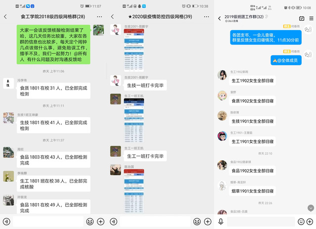 接到学校启动校园全封闭管理的通知后,学院高度重视、快速响应,党政领导、全体辅导员第一时间入驻校园,迅速进入紧急工作状态,对学院疫情防控、学生管理、线上教学、科研工作等进行周密安排。学工队伍根据学校《疫情防控学生应急宿舍网格化管理方案》要求,迅速下沉各宿舍,第一时间建立楼宇四级网格名册,进一步明确所带学生离返校及特殊情况等,摸清底数,动态掌握学生情况,分类开展学生教育管理工作。严格健康打卡、组织核酸检测、排查行动轨迹、夜间归寝统计、校园文明督导、宿舍谈心谈话……24小时服务不断线,坚决筑牢校园“防疫墙”。