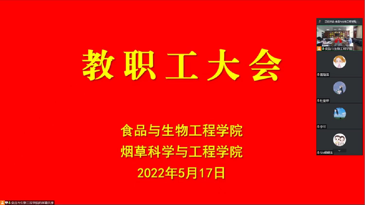 为贯彻落实5月16日学校中层干部会议精神,安排当前疫情防控工作,稳步推进下一阶段各项工作,食品与生物工程学院(烟草科学与工程学院)于5月16和17日,以线上线下相结合的方式分别召开领导班子会议、教职工大会。学院领导班子、全体教职工参会,会议由院长白艳红主持。