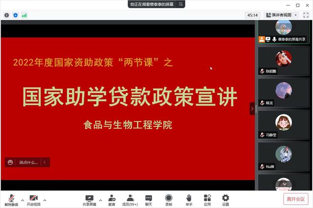 为广泛宣传国家资助政策,进一步落实好国家资助政策宣传“两节课”工作,食品与生物工程学院于5月27日召开2022年度国家资助政策线上宣讲会,资助专项老师蔡晨阳、各班班长团支书、组宣委员以及学生代表参加了本次会议。