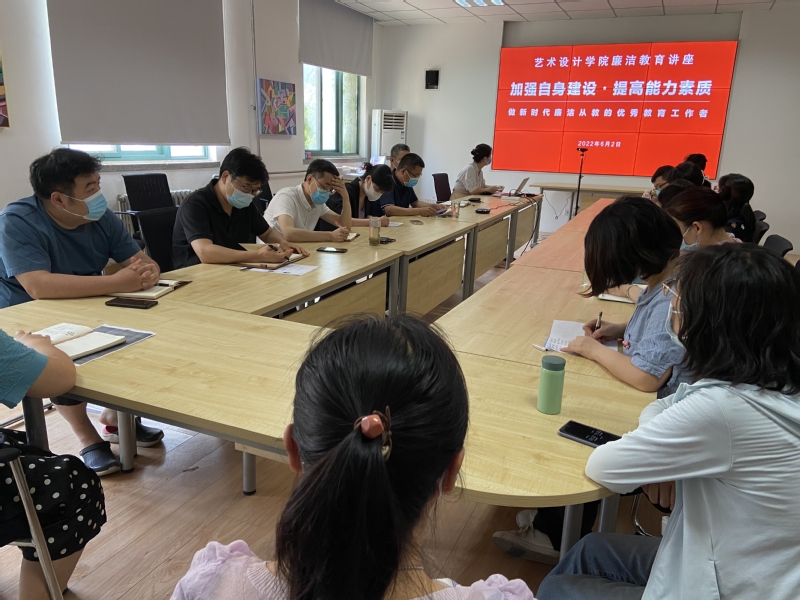 6月2日下午,艺术设计学院在东四楼307会议室开展廉洁教育讲座,本次讲座的主题是“加强自身建设,提高能力素质,做新时代廉洁从教的优秀教育工作者”,学院党委书记邵元珠担任本次讲座的主讲人。讲座采取线上线下形式进行,学院行政、实验教师在东四楼307会议室参加,其他教师线上参加。