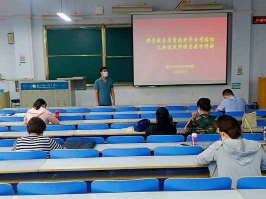 为贯彻落实学校“课堂教学质量提升年”活动要求,结合学院“大学习大培训大练兵大提升”活动方案,进一步提高青年教师的教学水平,提升教学创新能力。6月2日下午,数学与信息科学学院在东一楼218教室举行“新进教师课堂教学评讲”活动。学院领导班子成员、省级教学标兵、省校级教学名师、省校级教学大赛获奖教师和全体青年教师参加了本次活动。会议由教学副院长何国亮主持。