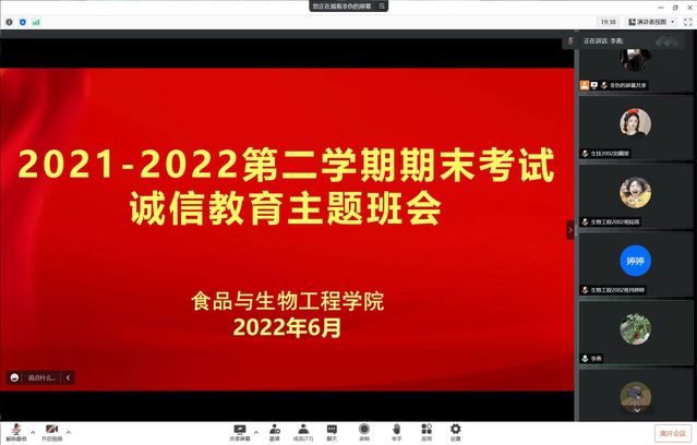 为强化学生诚信考试观念,树立良好考风考纪,提高学生安全防范意识,近日,食品与生物工程学院组织召开线上诚信考试暨安全教育大会。