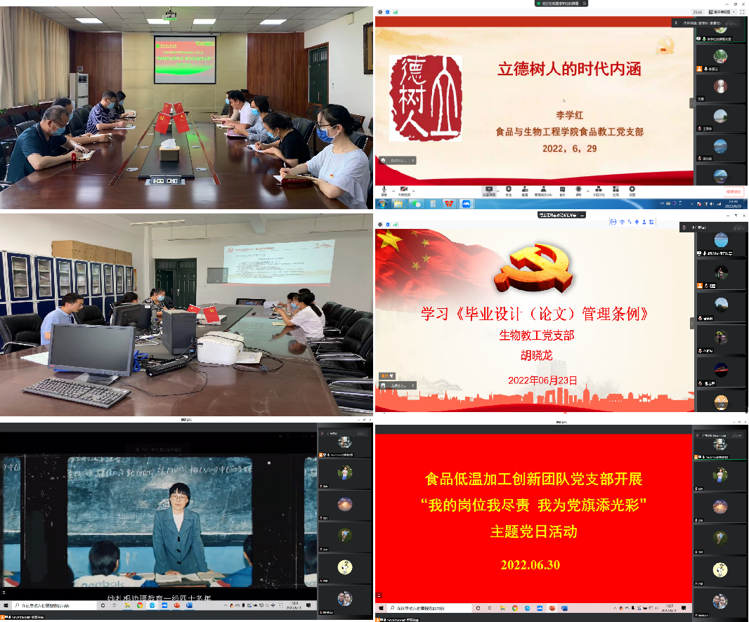 为庆祝中国共产党成立101周年,喜迎党的二十大胜利召开,结合“能力作风建设年”活动和师德师风建设,近期,食品与生物工程学院各教工党支部开展“我的岗位我尽责 我为党旗添光彩”迎“七一”主题党日活动。活动由各党支部书记主持。