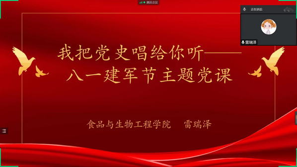 为庆祝中国人民解放军建军95周年,弘扬爱国拥军优良传统,8月1日,食品与生物工程学院学生党支部开展“我把党史唱给你听”喜迎建军95周年音乐主题党课。本期党课采用线上方式开展,由雷瑞泽老师主讲。