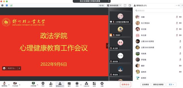 96日晚,政法学院召开心理健康教育工作线上会议,学院党委副书记刘放美、心理专职老师李昊轩、心理部成员、各班心理委员、蒲公英使者参加本次会议,会议由李昊轩老师主持。