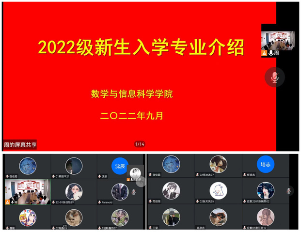 为使2022级新生全面了解所学专业,熟知各专业就业前景,更好地规划自己的学业生涯,推进学院在发挥人才培养方面的优势,数学与信息科学学院于9月8日下午召开2022级新生专业介绍会,学院数学与应用数学系主任荣民希、信息与计算科学系主任许振华、教务老师徐倩、新生辅导员以及全体新生参加大会。