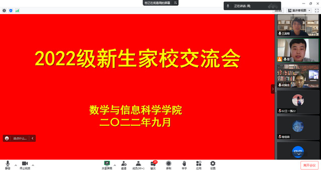 为进一步加强家校之间的沟通交流,帮助新生家长更好地了解学校和学生未来在校的学习生活,解答新生和家长疑惑,9月9日数学与信息科学学院通过线上召开了2022级新生家校交流会,学院党委副书记王燕翔、副院长何国亮、新生辅导员周四晴、2022级全体新生及新生家长出席会议。