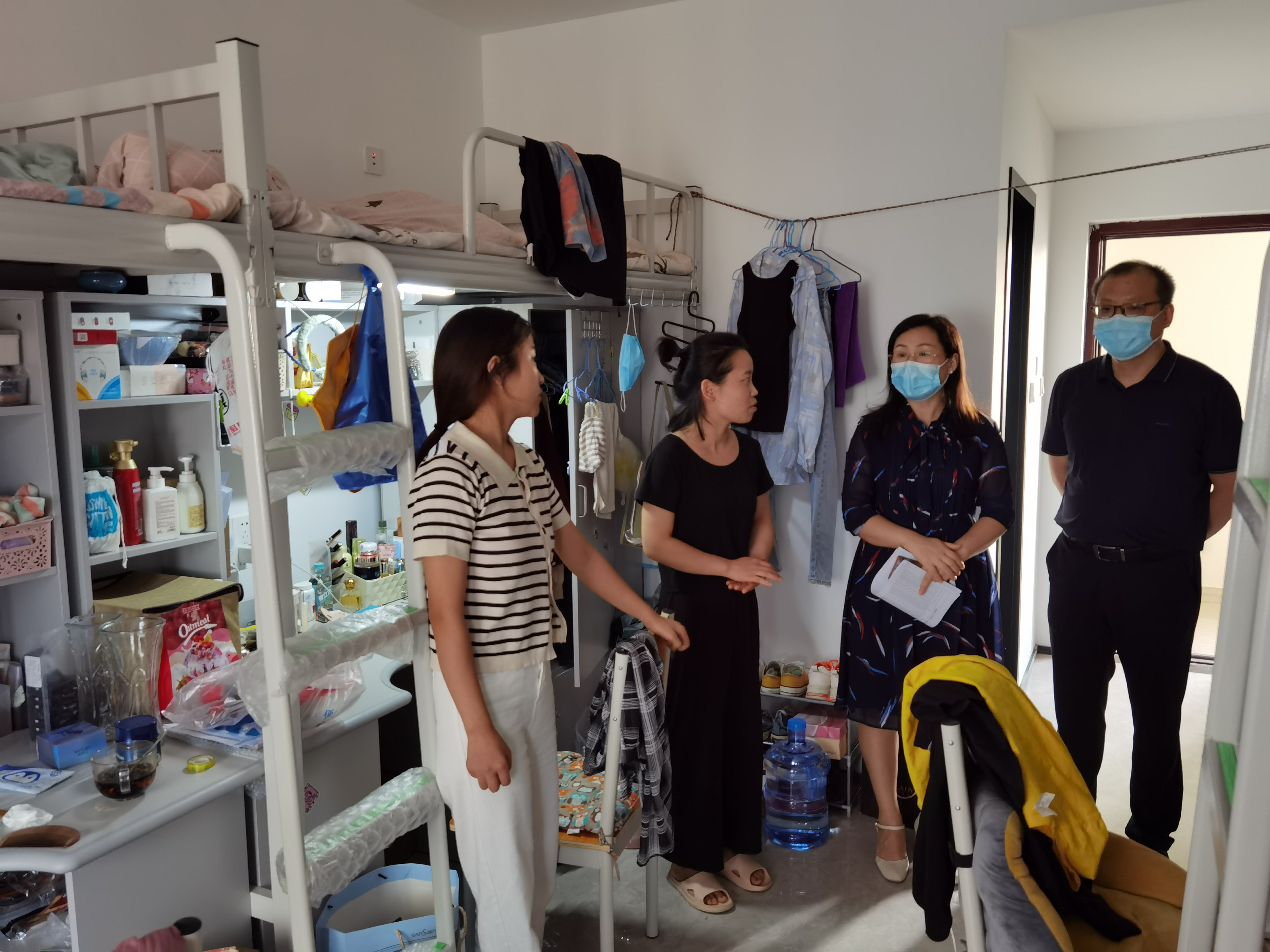 在走访中,学院领导老师与同学们亲切交流,详细询问了同学们的报到情况、对宿舍环境的适应程度、生活上是否遇到什么问题以及毕业院校专业学习情况等。叮嘱同学们要注意加强返校后的个人防护,保持良好心态,及时向家人报平安,让家人放心。同时提醒大家,在疫情防控常态化背景下,希望各位同学理解并自觉遵守学校疫情防控管理规定,涵养良好心态,做好防护工作,按时参加核酸检测,在学习和生活中遇到问题及时向老师寻求帮助;同时,鼓励大家明确未来规划,提高抗压能力,锤炼过硬本领,度过充实的研究生生活。