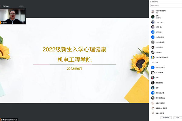 为更好的帮助新生适应大学阶段的学习和生活,增强学生的心理健康保健意识。9月17日,机电工程学院在线上开展了2022级新生入学心理健康教育活动。此活动由学院心理健康教育工作专职辅导员徐莉老师主持,2022级同学参加了本次活动。