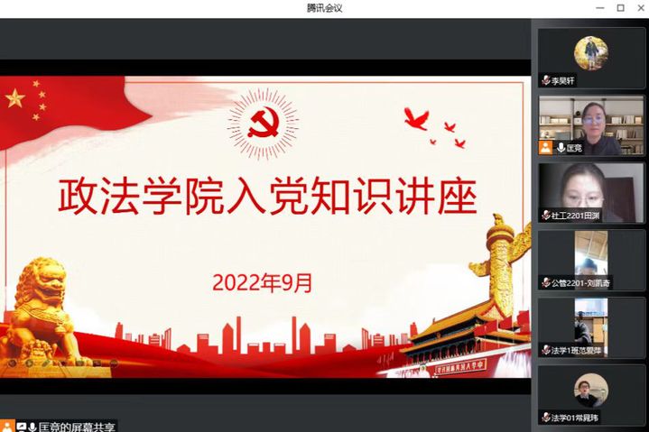 9月22日下午,政法学院举办 “志存高远 一心向党”入党知识讲座,政法学院组织员匡竞和2022级本科生、研究生参加。
