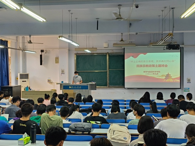 为帮助广大新生更好的掌握党和国家的民族宗教政策,了解民族宗教知识,强化宗教责任意识,引导学生坚定理想信念,9月30日,数学与信息科学学院在东一楼218教室召开2022级新生民族宗教政策宣传学习主题班会,全体2022级新生参加会议。