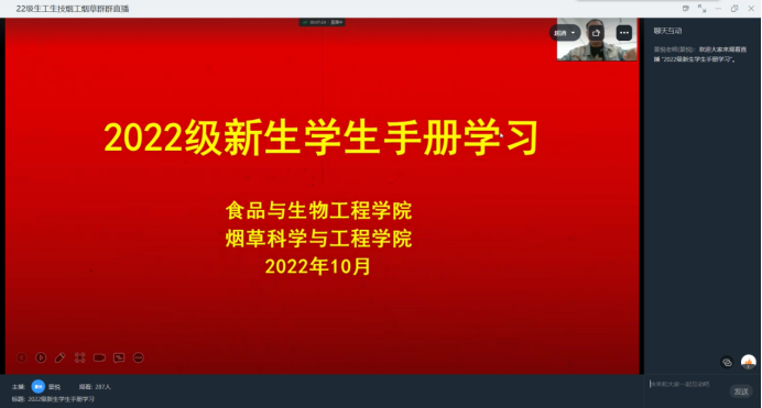 为强化学生的纪律意识,落实行为规范教育,培养优良学风,食品与生物工程学院于10月5日组织2022级新生线上学习《学生手册》,新生辅导员与全体新生参与活动。