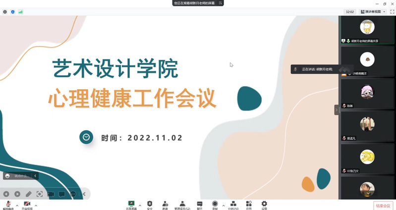 为进一步加强学生心理健康教育工作,充分发挥学生干部在疫情防控期间的积极作用,于11月2日下午,艺术设计学院通过线上召开心理健康工作会议,会议由心理健康专职辅导员会由胡新月老师主持,学院心理部成员及全体心理委员参加了此次会议。