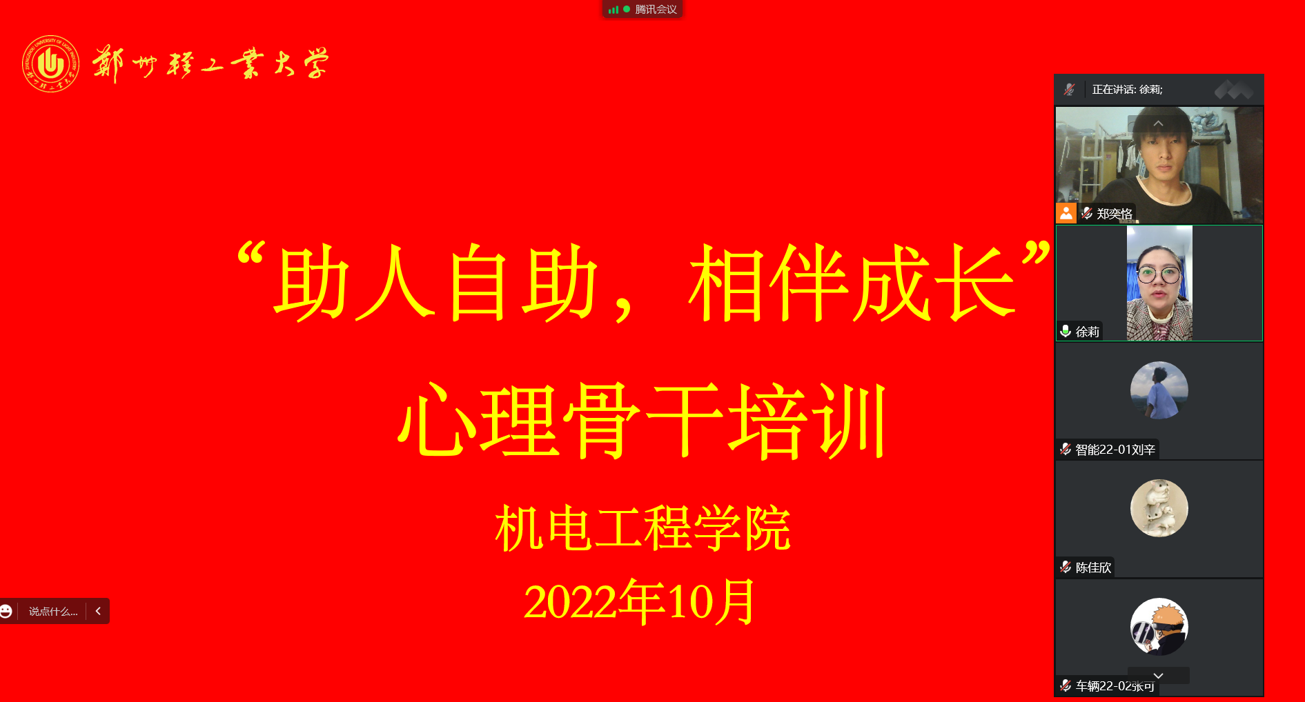 为充分发挥疫情防控状态下学院心理骨干的辐射作用,机电工程学院开展了线上心理骨干培训。本次培训由负责学院心理健康教育工作的专职辅导员徐莉老师主讲,学院心理部骨干成员以及各班心理委员参加。