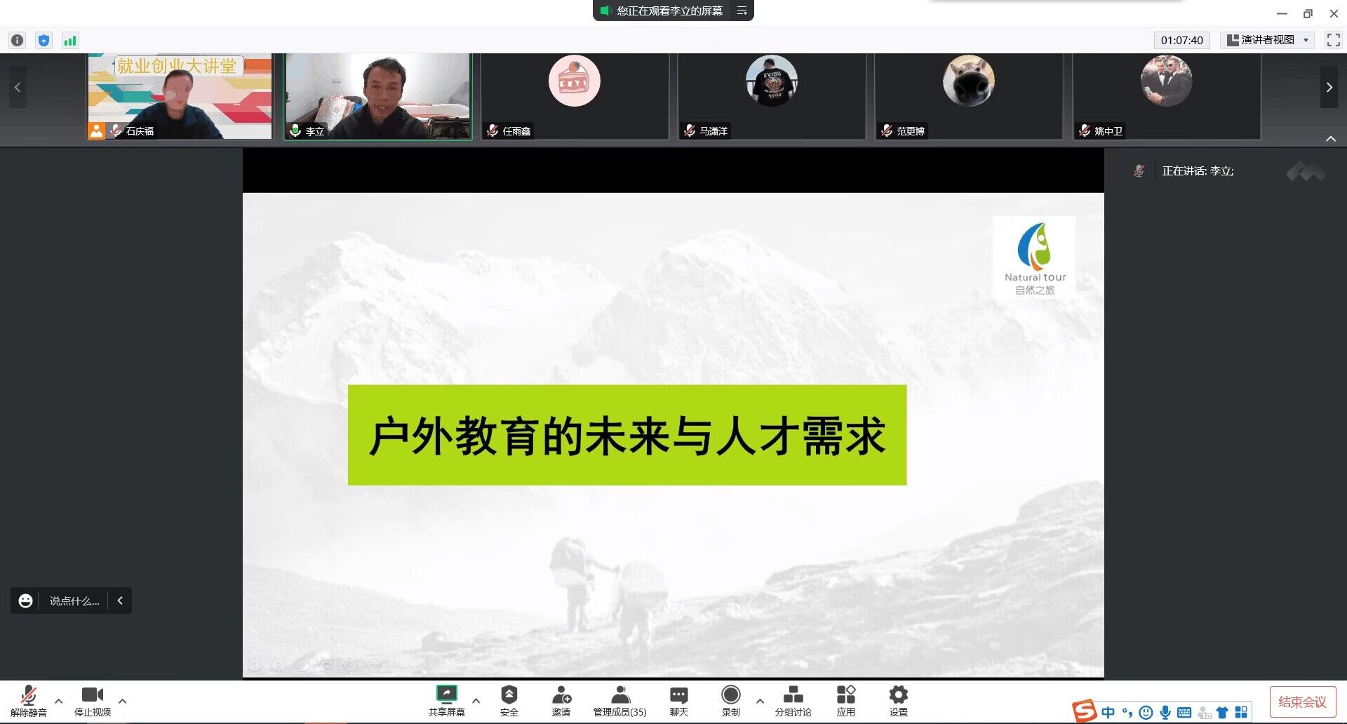 为帮助同学们了解户外运动行业发展现状和户外运动行业对人才的需求,11月9日,体育学院采用腾讯会议的形式在线上举办了主题为“户外运动行业的发展与人才需求现状”的就业创业大讲堂活动。本次大讲堂邀请了中国登山协会青少年委员会副秘书长、河南省登山户外运动协会副会长、河南“自然之旅”户外运动品牌创始人李立先生主讲。