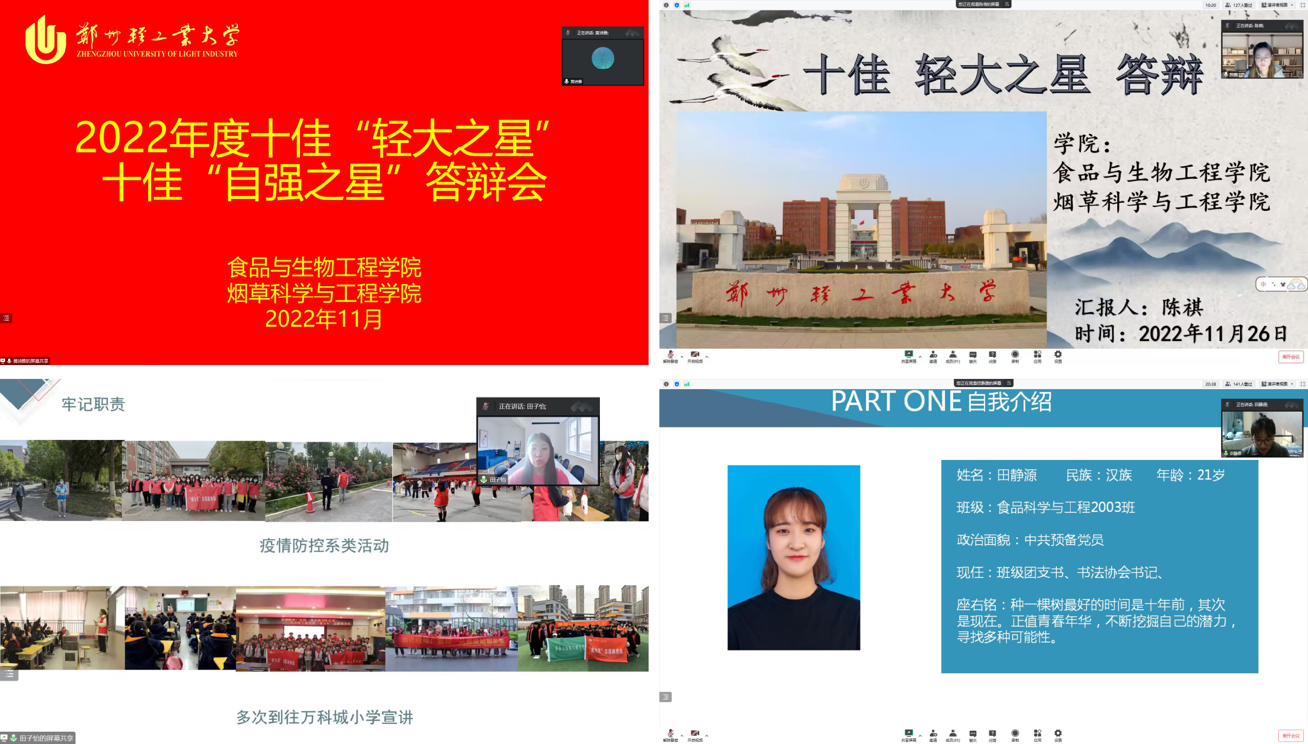 1126日,食品与生物工程学院线上举办十佳“轻大之星”、十佳“自强之星”评选答辩会学院全体辅导员和低年级学生参加了本次活动