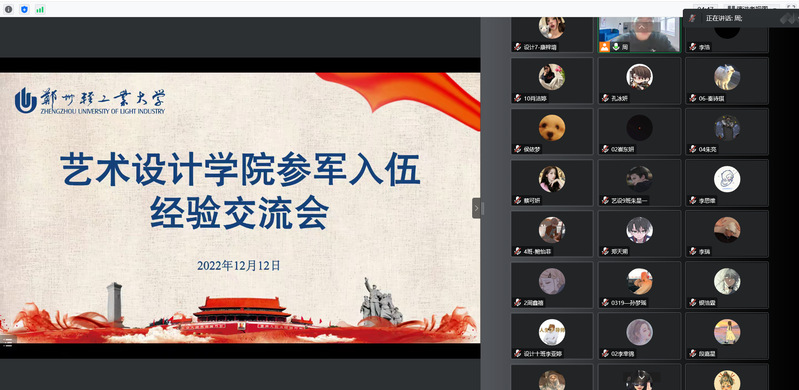 为响应国家号召,强化高校学生国防观念,鼓励大学生积极参与应征入伍,推进国防和军队现代化建设。2022年12月12日,我校艺术设计学院召开了2023年春季征兵入伍线上经验交流活动,由2022级辅导员周晓浩主持,学工办主任霍庆媛、2022级全体学生参加。