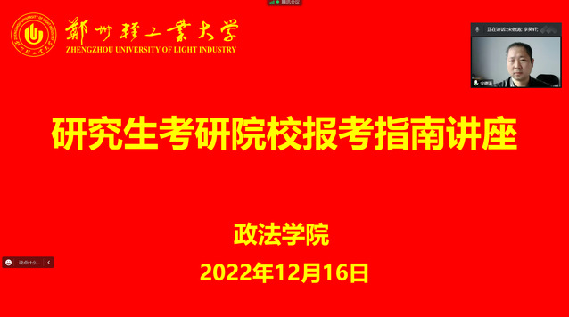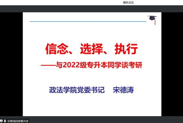 12月16日上午,政法学院举办2022级专升本考研动员大会暨考研院校报考指南讲座。讲座由学院党委书记宋德涛主讲,学院就业专干李昊轩和2022级专升本学生参加了会议,会议由学院党委副书记刘放美主持。