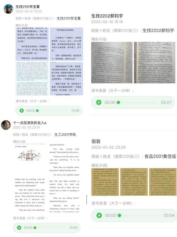 活动伊始,由学院榜样领航员面向全体学生发起“21天每日阅读打卡”挑战,呼吁并带领同学们一起感受书籍的魅力,领略文字的力量。活动要求通过上传当日阅读内容及朗读音频进行每日读书打卡,同学们积极响应,自觉坚持,有的同学结合阅读内容,记录当下所思所悟,字里行间流露真情实感;有的同学将书籍中令人印象深刻的词句摘抄下来,或在书旁进行批注,字迹工整,学思相资,与书对话;有的同学则通过声情并茂的朗读,细细品味书中韵味,认真品读书中人生。读书打卡群中,同学们彼此相互督促,相互激励,共同进步,在阅读中陶冶情操,拓展视野,度过了一个充实且有意义的假期。
