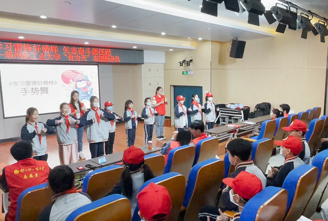 活动伊始,志愿者与小朋友同唱歌曲《孤勇者》,调动大家积极性,带动现场气氛;宣讲环节,志愿者向大家介绍雷锋的生平事迹、名言警句等内容,以简单明了的语言阐述雷锋精神的时代内涵,小朋友们聚精会神,为雷锋的事迹所动容;接着,在舒缓的音乐声中,志愿者们同小朋友一同朗诵原创诗歌《颂雷锋》,歌颂雷锋的英雄事迹同时也传达着新时代青年学习雷锋精神的坚定决心;最后,志愿者们带领全体小朋友一起学习手势舞《学习雷锋好榜样》,大家热情高涨,动作整齐划一,欢快嘹亮的歌声响彻整个报告厅。感悟分享环节,小朋友们纷纷表示要做新时代的追“锋”少年,积极践行雷锋精神,爱党爱国,坚定信念,服务他人,奉献社会。