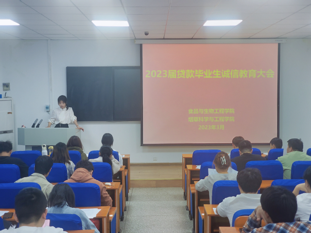 为帮助贷款毕业生了解掌握还款流程和注意事项,增强毕业生诚信还款意识和社会责任感,3月10日下午,食品与生物工程学院在食工楼209教室召开了2023届贷款毕业生诚信教育大会,学院资助专项老师蔡晨阳及全体贷款毕业生参加了此次会议。