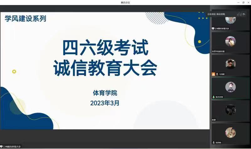 为加强学风建设,严肃考风考纪,3月10日,体育学院组织召开大学英语四、六级考前诚信教育会,体育学院全体参加大学英语四、六级考试的同学参加了会议。