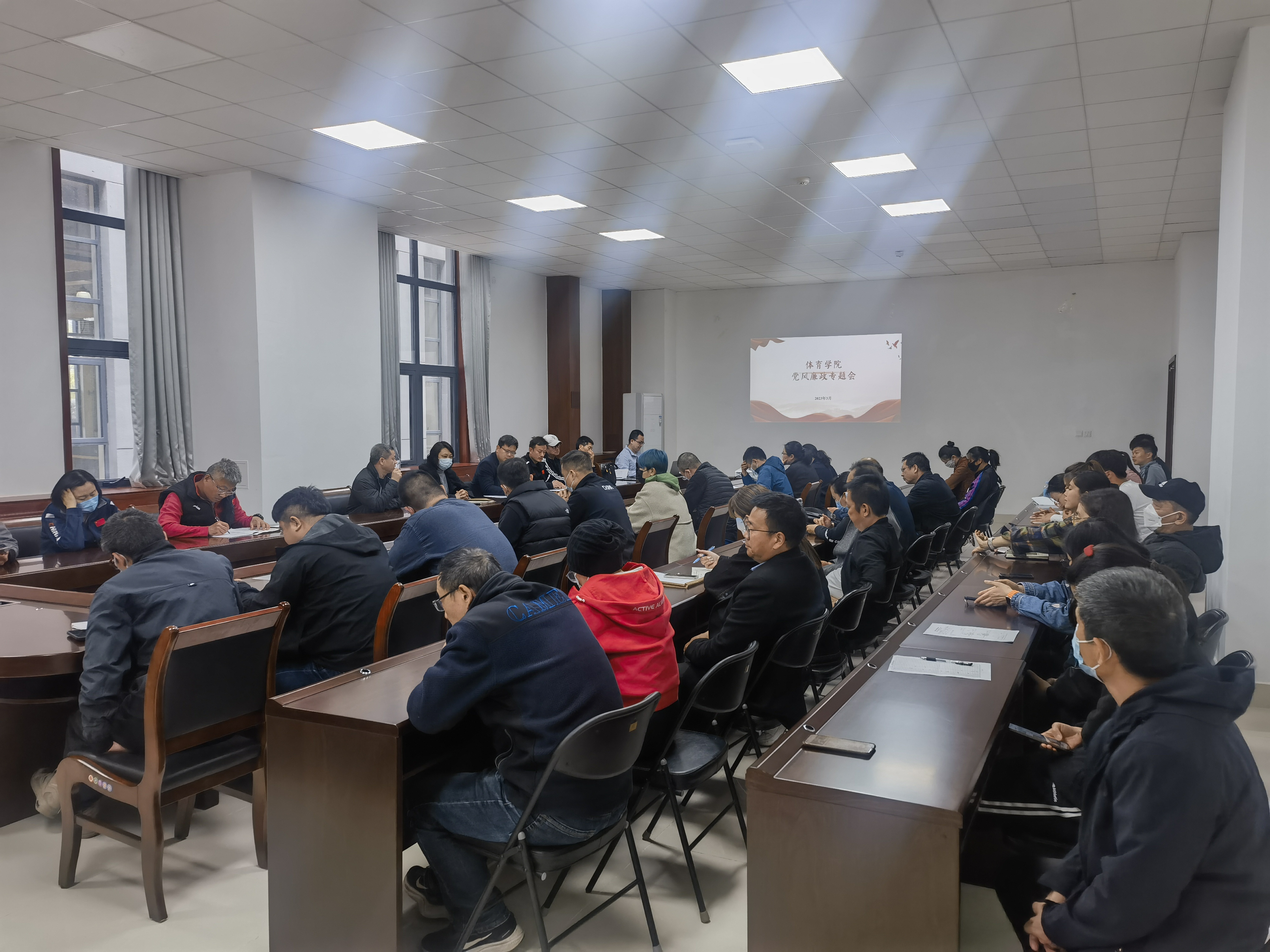 3月30日下午,体育学院在科学校区体育馆会议室召开2023年全面从严治党工作会议。体育学院全体教职工参加了会议,会议由学院党总支书记张根清主持。