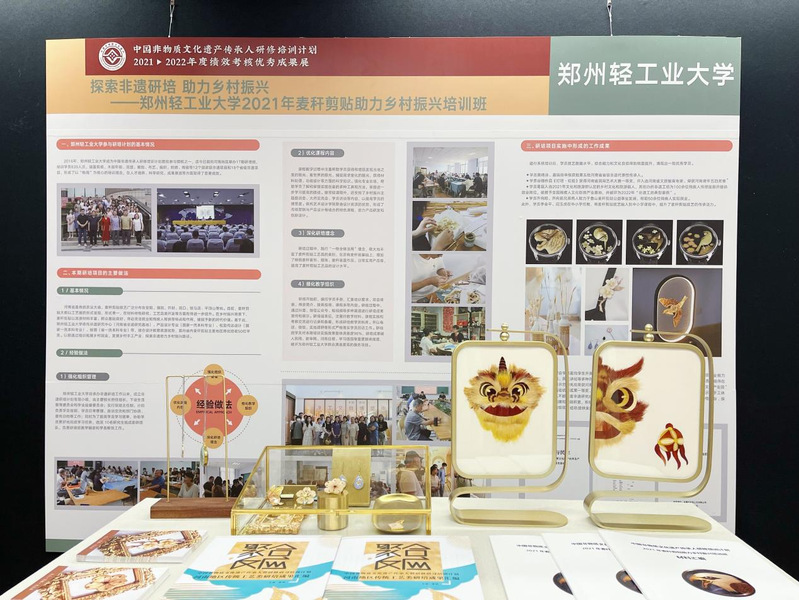 活动期间,文化和旅游部发布了中国非物质文化遗产传承人研修培训计划2021-2022年度绩效考核结果并颁奖。考核围绕研培班的教学组织、教学管理、保障机制、教学效果及反馈评价等五个方面进行。学校实施的“2021年麦秆剪贴助力乡村振兴培训班”获评优秀。作为中国非遗传承人研修培训计划首批参与院校之一,自2016年以来,已面向河南地区举办17期研培班,培训学员839人次,涵盖剪纸、木版年画、泥塑、雕刻、布艺、编织、刺绣、陶瓷等12个国家级非遗项目和18个省级非遗项目,形成了以“物用”为核心的培训理念;通过强化组织管理、优化课程内容、深化研培理念、细化教学组织,在人才培养、科学研究等方面取得了显著成效,研究成果先后在河南博物院、河南省美术馆、禹州钧官窑址博物馆等场馆展出,并被人民网、新华网、河南日报、学习强国等重要媒体报道。