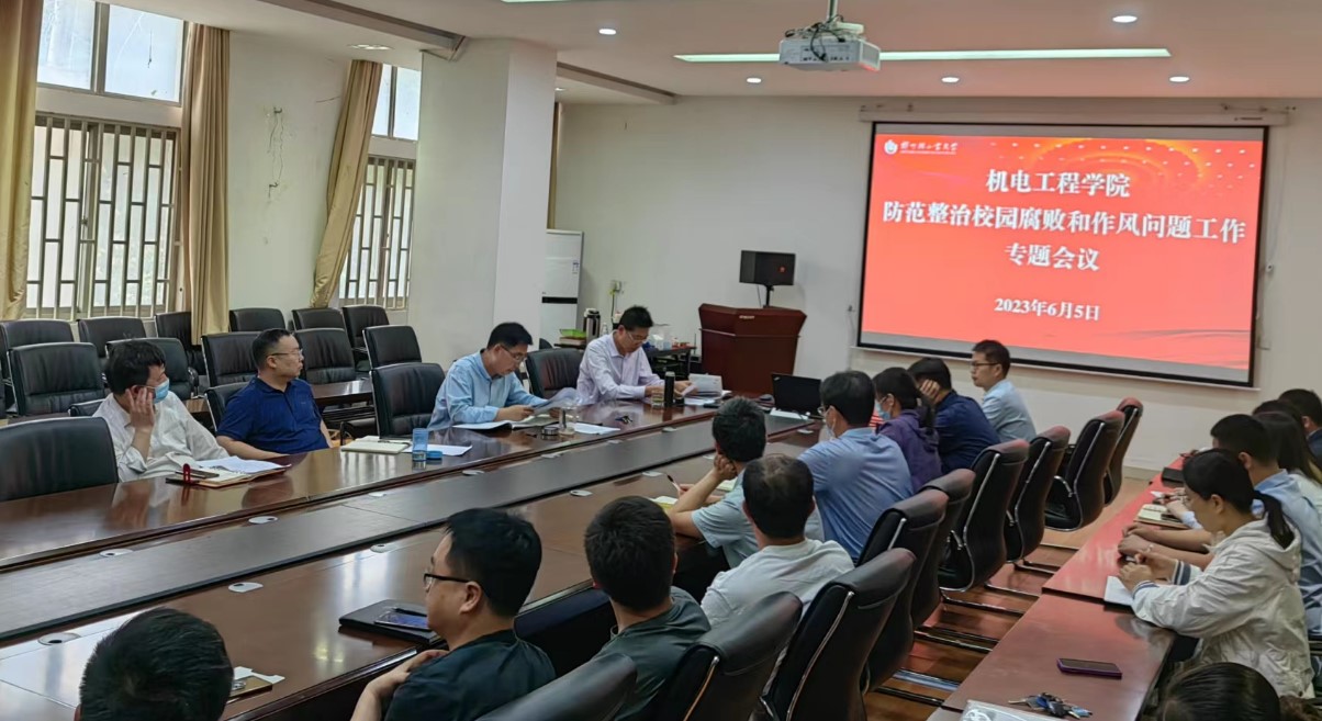 6月5日下午,机电工程学院党委在东风校区西三楼215会议室召开防范整治校园腐败和作风问题工作专题会议,学院班子成员、系(中心)主任、党支部书记、辅导员等参加。会议由院党委书记刘国豪主持。