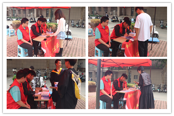 为确保此次活动顺利进行,学院组织志愿者提前在东风校区宿舍楼下布置临时捐书场地,精心设计积极宣传,希望能为参与此次活动的同学留下一份温暖而难忘的回忆。活动倡议一经发出,便得到了毕业生的积极响应,前来捐赠书籍的同学络绎不绝。活动开始后,毕业生将准备好的旧书带到现场,为需要充实书单的同学带来帮助。志愿者们对捐赠者的信息进行登记,对捐赠者提出的问题做了详细的回答,并与捐赠者合影留念。捐书活动结束后,志愿者对同学们捐赠的书籍进行清点,将书籍按照类别进行整理,捐赠给图书馆。