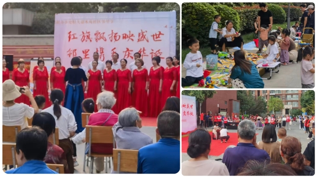活动现场人头攒动,热闹非凡,各类活动精彩纷呈,各富特色。在公益宣传区,工作人员对居民进行了法律法规、宗教政策、防骗反诈、应急救援等多方面知识的普及与宣传,旨在全方位提升居民的法律素养和安全防范意识。文化集市上,绘画、编织、传统书法、图书展览等摊位,犹如一扇扇展示中国传统文化的窗口,让居民们沉浸式地领略中国传统文化深邃而独特的魅力。儿童跳蚤市场是活动的一大亮点,孩子们像模像样地扮演起“小老板”的角色,热情地向过往的“顾客”推销着从家里精心整理出来的闲置物品。这一活动不仅锻炼了孩子们的社交能力和理财意识,更让他们在实践中体会到了物品的价值和资源循环利用的环保意义。表演舞台上,居民代表们化身“歌舞演员”,用美妙的歌声和优美的舞姿,表达着对伟大祖国的热爱和对美好生活的向往,为整个活动增添了浓郁的喜庆氛围。