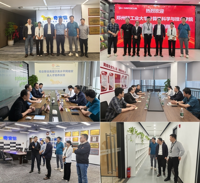 走访中,在奇安信科技集团股份有限公司,负责人熊国强详细介绍了公司的发展历程、企业文化、业务范围等情况,双方围绕企业人才需求、学生实习就业、产教融合等进行深入交流,并就如何加强合作、共同培养高素质人才等问题进行了探讨。学院党委书记宋文军介绍了学院的专业设置、人才培养模式以及毕业生的基本情况,希望双方能进一步开展交流探讨,搭建合作平台。在绿盟科技集团股份有限公司,公司负责人纪伟伟带领计算机学院一行参观了企业的办公环境、技术研发区等区域,介绍了企业发展历程、组织机构、技术团队、业务范围等方面情况,表达了希望双方在学生实习实践、人才培养等方面持续深化合作的意愿。双方就人才培养、实习实训、就业创业等方面问题进行了深入交流。