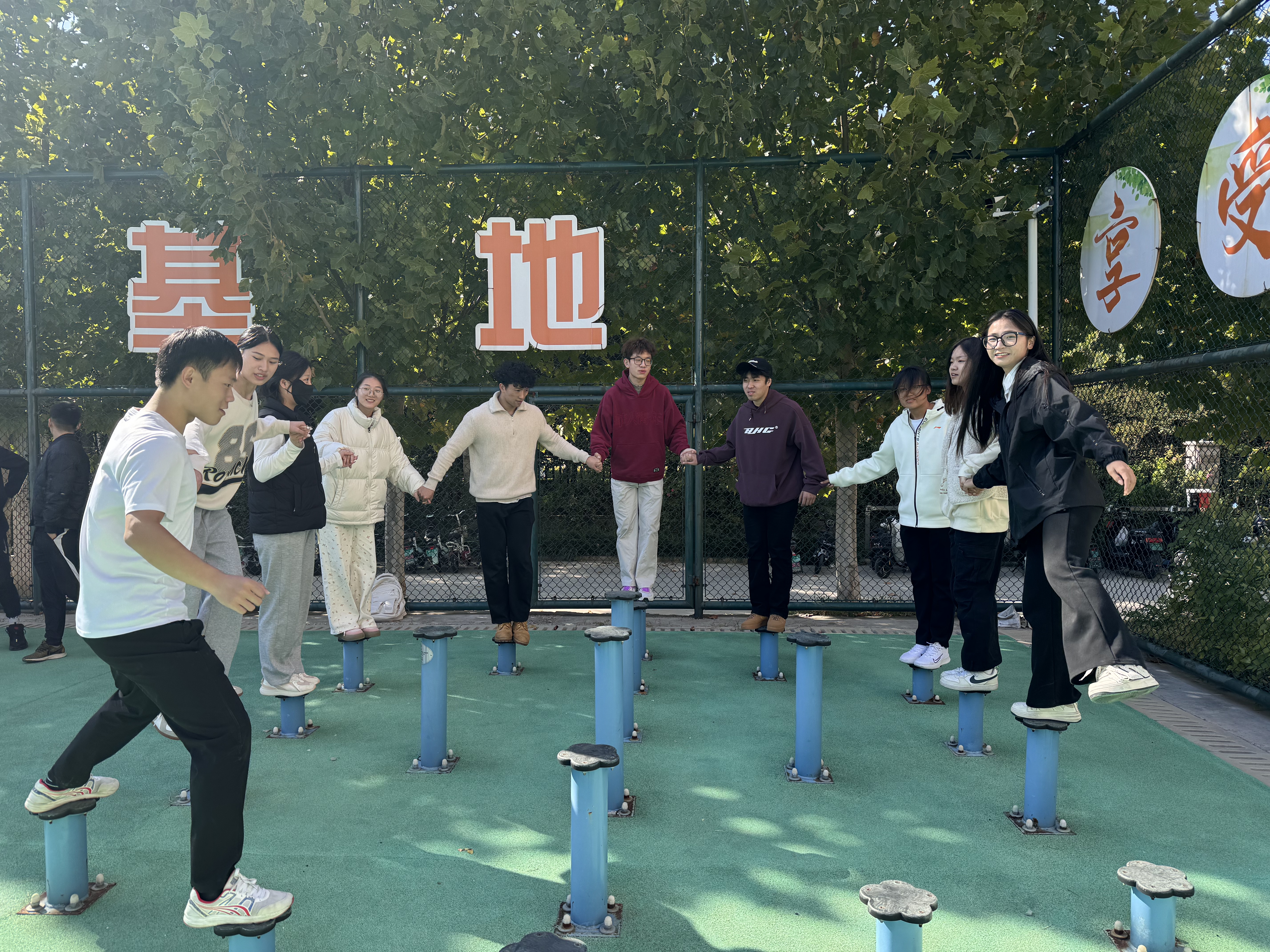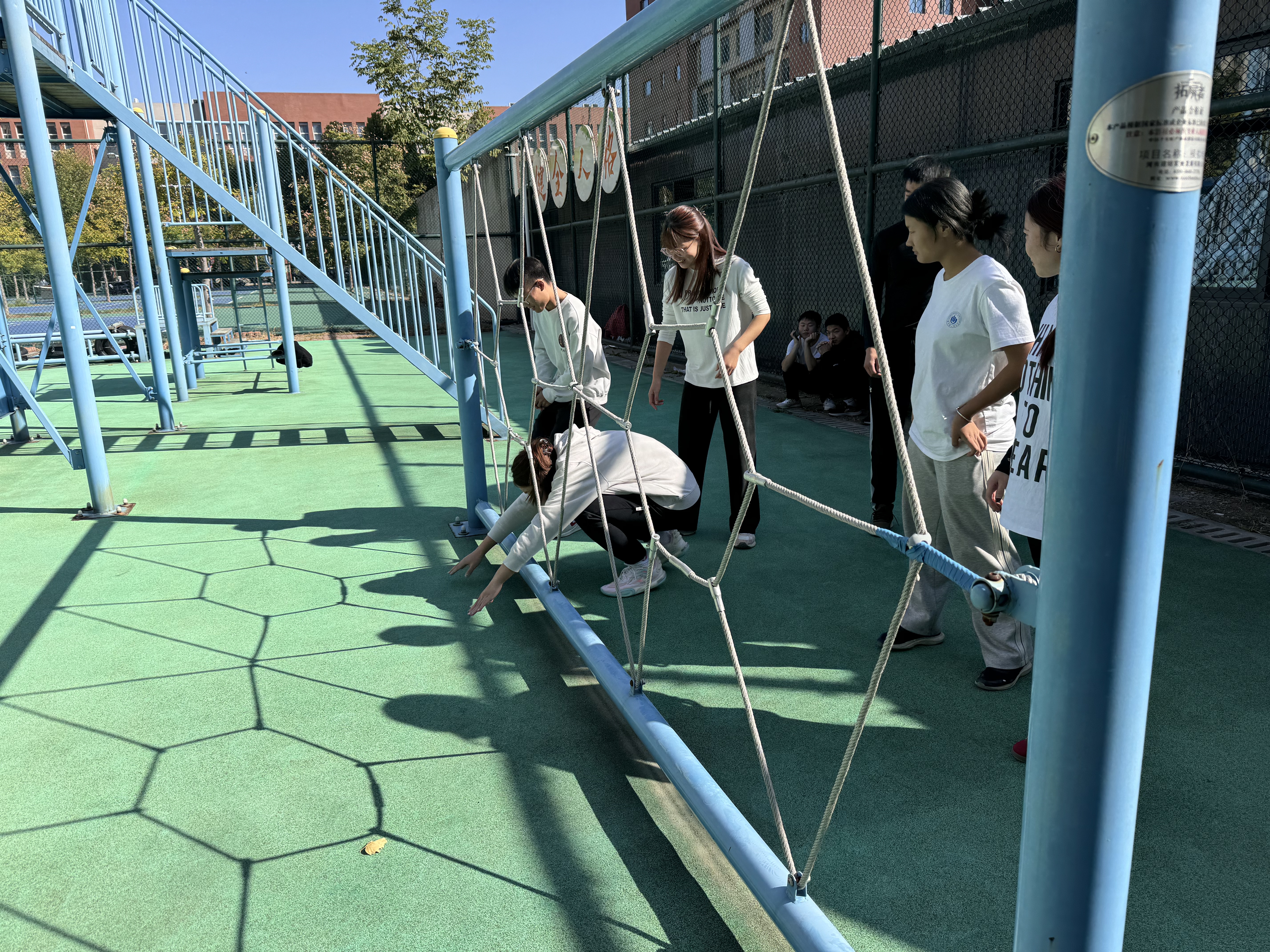 活动伊始,陈老师对将要项目活动的内容和要求进行详细介绍,并希望同学们通过丰富多彩的活动形式,加深彼此了解,有效地释放学习、生活中的压力。接着,工作人员组织同学们自由结合,组成三个小组进行团队协作,场面气氛瞬间活跃起来。活动由“团结一心”“梅花桩”“穿越电网”“不倒森林”“大河之舞”“友谊留恋”等游戏项目组成,各组选手发挥个人协调能力和团队合作能力,克服内心的恐惧,努力攻克难关,全身心的投入游戏,在一次次的尝试中不断进步。