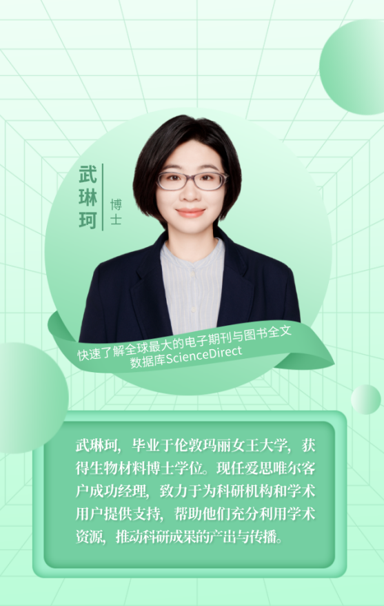 武琳珂,毕业于伦敦玛丽女王大学,获得生物材料博士学位。现任爱思唯尔客户成功经理,致力于为科研机构和学术用户提供支持,帮助他们充分利用学术资源,推动科研成果的产出与传播。