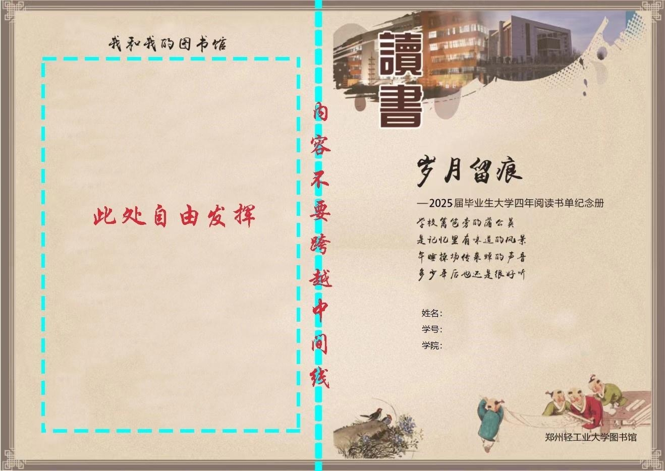 2.毕业生自行下载相应模板,其中封面的姓名、学号、学院由毕业生根据个人实际填写;封底的“我和我的图书馆”由毕业生填写个性化的内容,可以是和图书馆的合影,也可以是自己的感想等;内页阅读书单内容根据表格填写题名、责任者、借阅日期、归还日期、馆藏地信息(请不要改变表格样式和字体样式、颜色)。