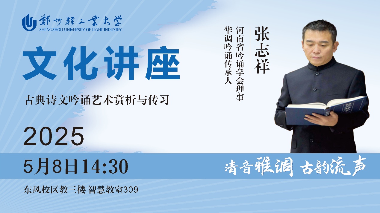 传统吟诵文化是我国悠久历史文化中的瑰宝,作为一种独特的语言艺术形式,吟诵不仅展现了汉语的音韵之美,更蕴含着深厚的文化内涵。为进一步传播中华优秀传统文化,增强师生文化自信,促进吟诵传承发展,展现中国诗词音律之美,应河南省吟诵学会及我校教职工读书协会邀请,河南省吟诵学会理事张志祥将来校做《清音雅调 古韵流声——古典诗文吟诵艺术赏析与传习》文化讲座。