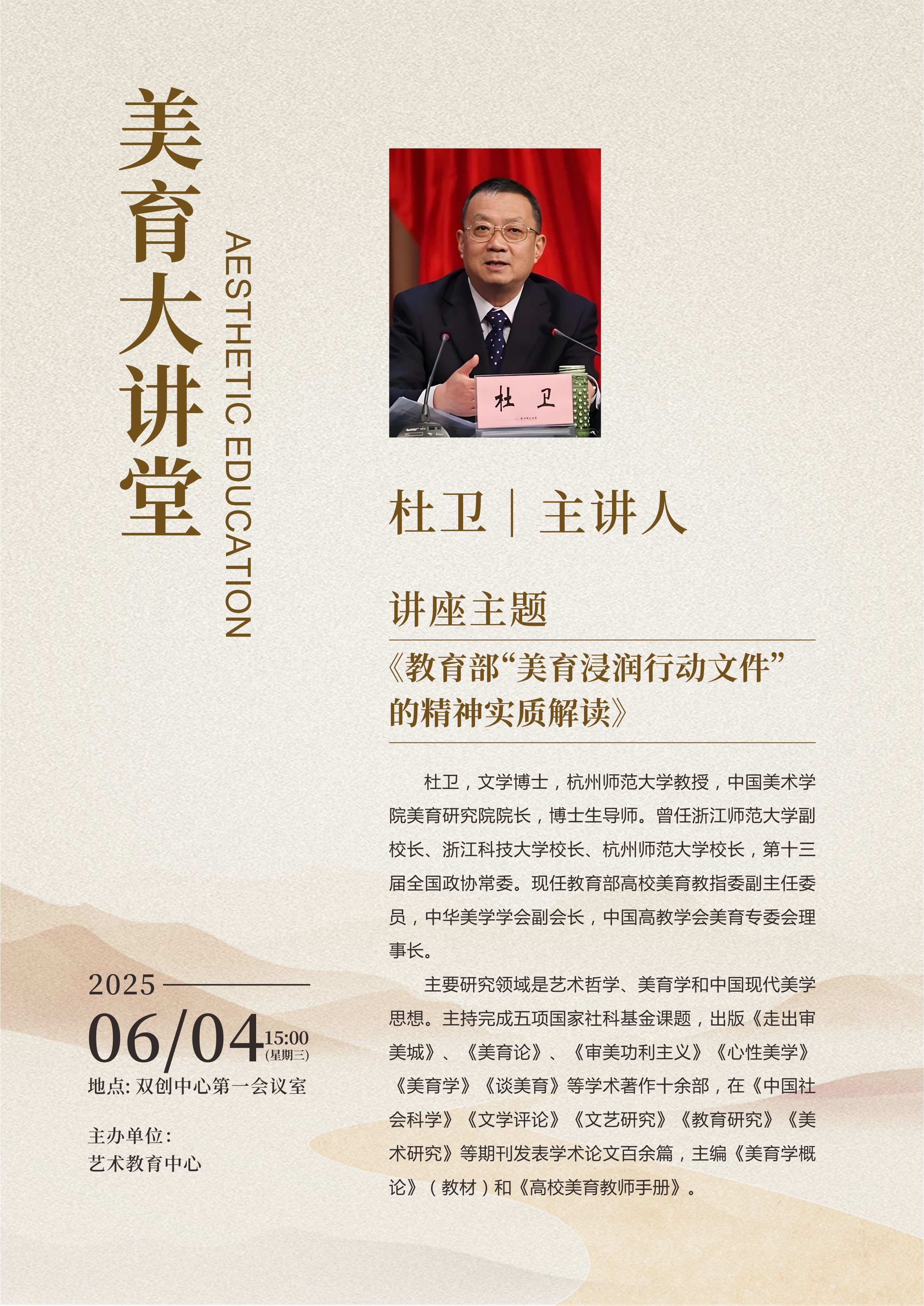 为深入贯彻教育部《全面实施学校美育浸润行动的通知》精神,扎实推进美育教学改革,提升美育育人成效,学校特邀教育部高校美育教学指导委员会副主任委员、中国高教学会美育专委会理事长、原杭州师范大学校长杜卫教授来校做《教育部“美育浸润行动文件”的精神实质解读》学术报告。具体事宜如下: