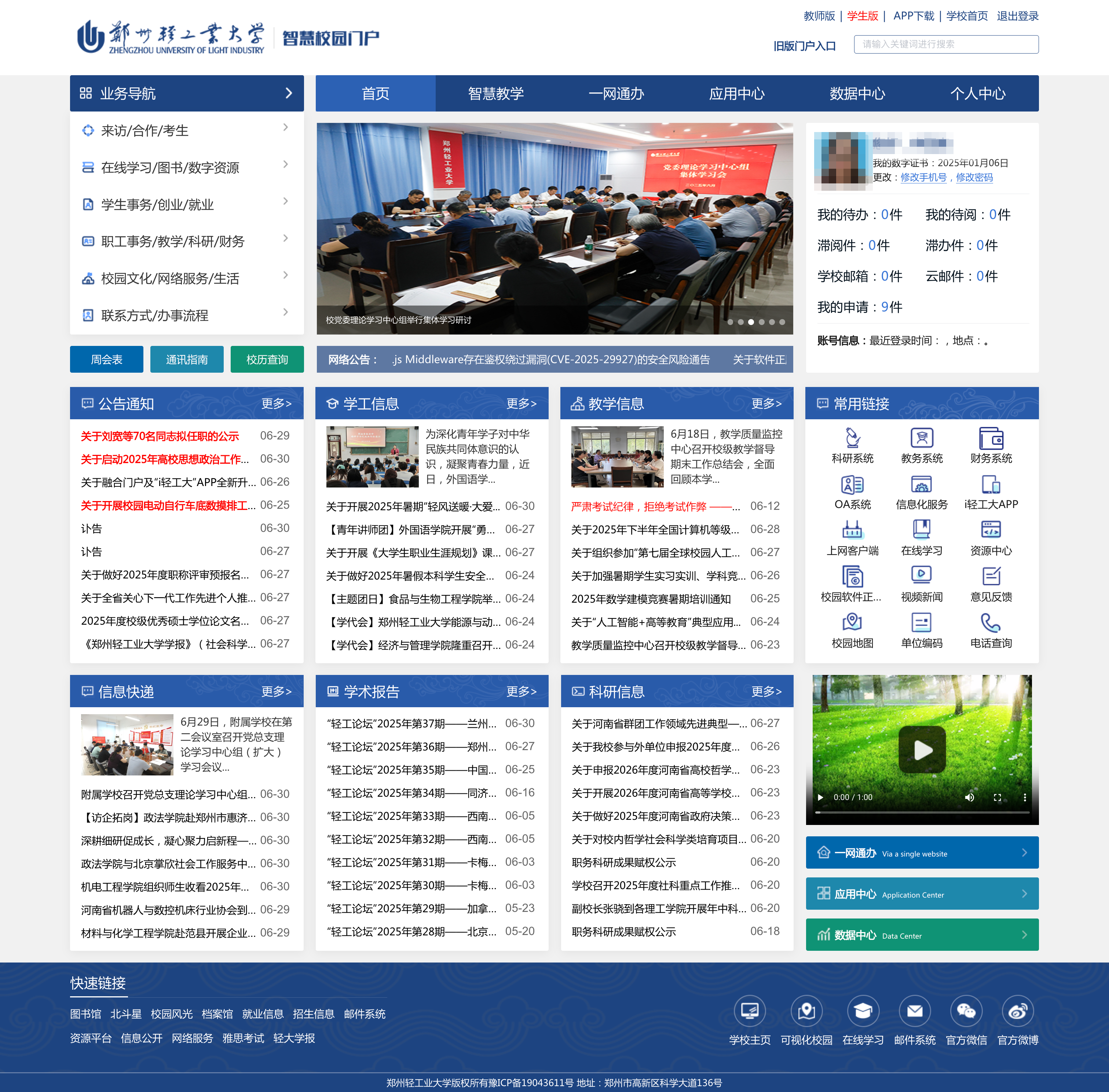 原智慧门户的校内通知、公示信息、系统消息及待办待阅等已迁移至融合门户。为避免门户升级为用户带来的不便,在10月以前,师生仍可登录原智慧门户,进行信息查询和业务办理,访问地址:https://campus.zzuli.edu.cn(也可以点击升级后新的融合门户右上角“旧版门户入口”进入)。