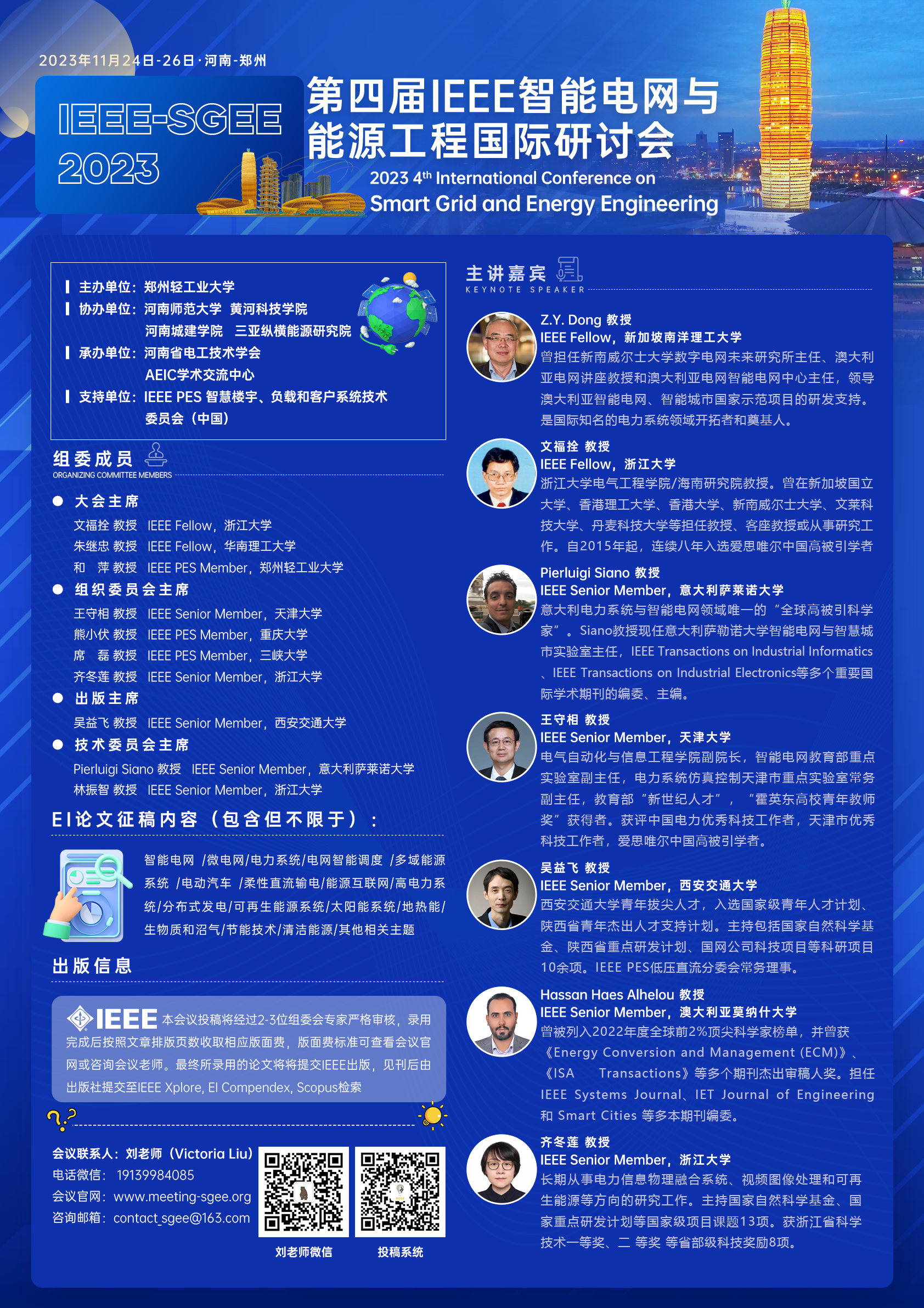 主办,IEEE PES智慧楼宇、负载和客户系统技术委员会(中国)支持,河南师范大学、黄河科技学院、河南城建学院、三亚纵横能源研究院协办,河南省电工技术学会、AEIC学术交流中心承办的第四届IEEE智能电网与能源工程国际学术会议将于2023年11月24日-26日在河南郑州召开。