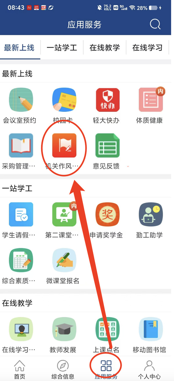 手机登录i轻工大APP,点击下方“应用服务”,在“最新上线”模块选择“机关作风评议”填写问卷。如下图所示: