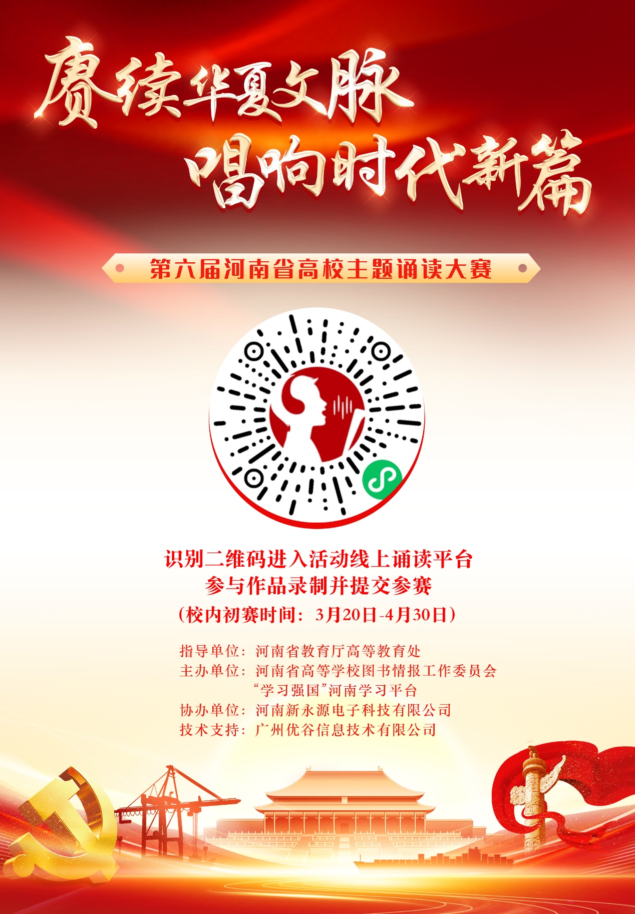 文脉绵延,薪火相传。为深入贯彻落实党的二十大和二十届二中、三中全会精神与河南省委宣传部《2025 年书香河南建设工程实施方案》的部署要求,进一步加快构建学习型社会,践行“推动中华优秀传统文化创造性转化、创新性发展”的时代使命,深化弘扬社会主义核心价值观教育,建设书香河南,丰富校园文化。河南省高等学校图书情报工作委员会联合“学习强国”河南学习平台决定举办第六届河南省高校“赓续华夏文脉·唱响时代新篇”主题诵读大赛。