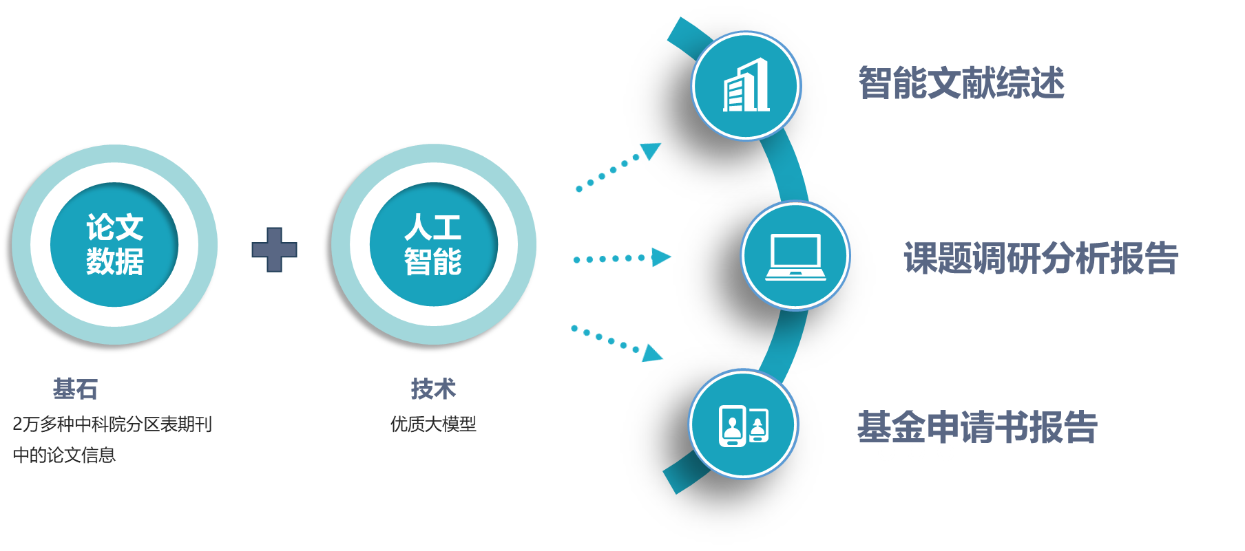 研知科研支持数据库依托2.1万种中国科学院分区表期刊中的论文信息,利用优质的大数据模型,结合权威真实文献及先进的人工智能,提供基金申请书报告、智能文献综述报告、课题调研分析报告等科研服务。