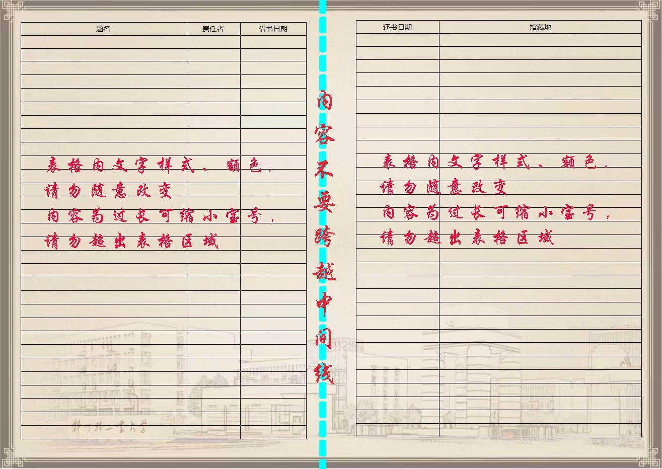 2.毕业生自行下载相应模板,其中封面的姓名、学号、学院由毕业生根据个人实际填写;封底的“我和我的图书馆”由毕业生填写个性化的内容,可以是和图书馆的合影,也可以是自己的感想等;内页阅读书单内容根据表格填写题名、责任者、借阅日期、归还日期、馆藏地信息(请不要改变表格样式和字体样式、颜色)。