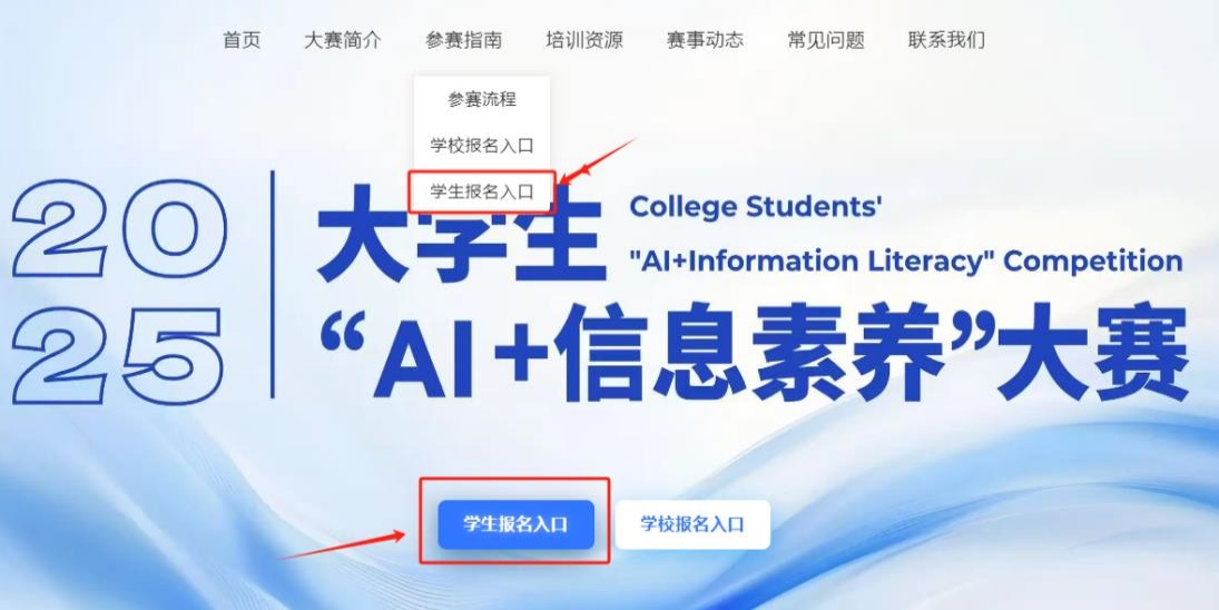 进入官网后,点击首页【学生报名入口】,也可点击【参赛指南】-【学生报名入口】,进入登录页面。