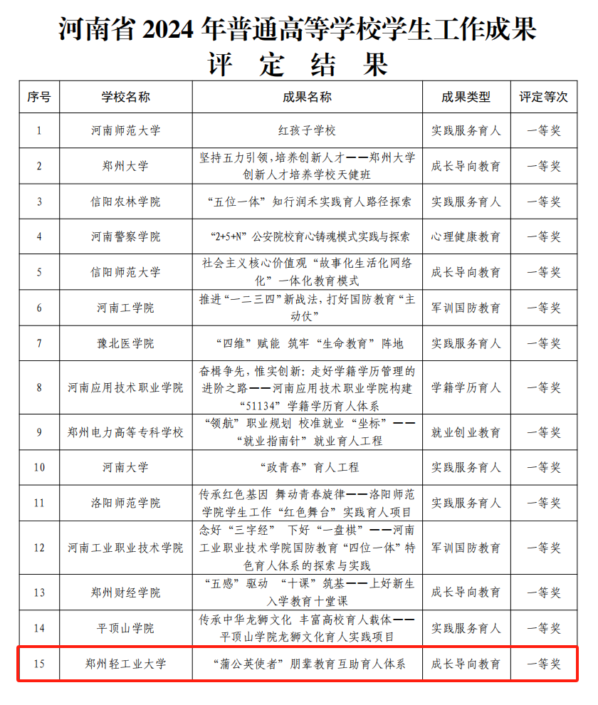 7月25日,河南省教育厅公布了2024年普通高等学校学生工作成果评定结果,我校申报的《“蒲公英使者”朋辈教育互助育人体系》项目荣获全省一等奖。